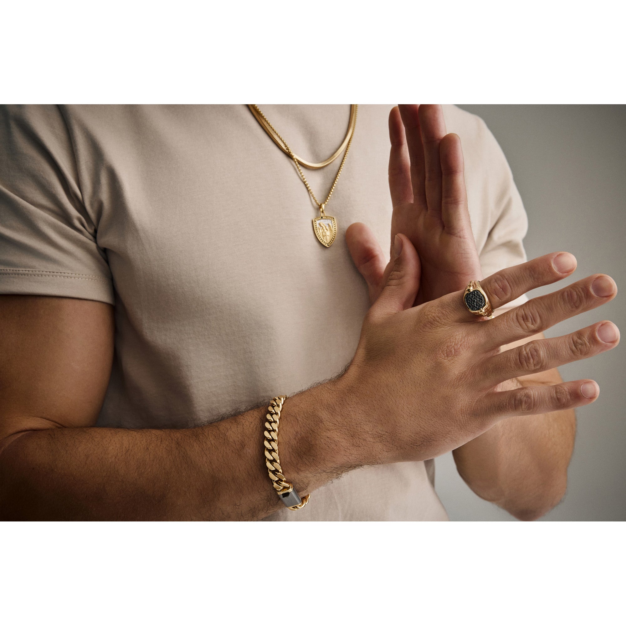 Elevate your presence with the Bulova BVC1101-YSNA, a masterfully crafted necklace blending heritage aesthetics with modern polish. This 22-inch squared “boxed-serpentine” snake-chain necklace is rendered in lustrous 14 K gold-plated sterling silver, creating a radiant silhouette that commands attention. The sleek 3.5 mm chain flows with fluid elegance, reflecting light subtly and catching glances with its refined geometry. Completed with a squared lobster-clasp closure — engraved with Bulova’s signature emblem — the necklace offers both secure wear and seamless style, perfect as a statement piece on its own or layered for a versatile, elevated look.