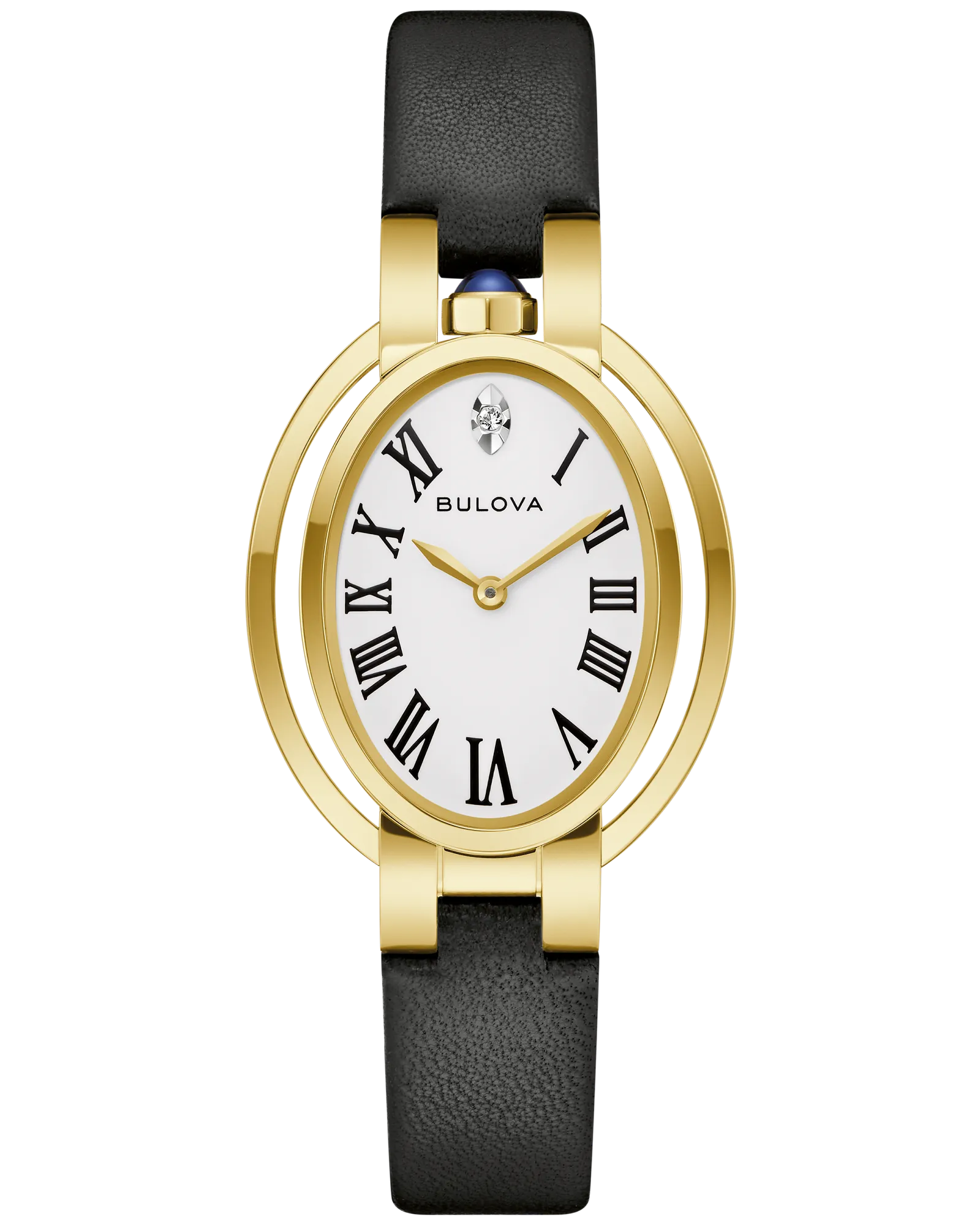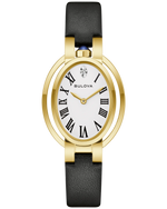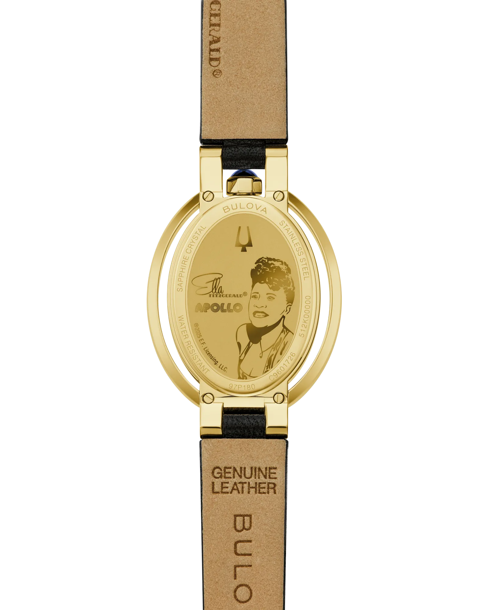 Celebrate elegance and musical legacy with the Bulova 97P180 Rubaiyat “Ella” Apollo Theater — a special-edition women’s timepiece that pays tribute to jazz icon Ella Fitzgerald and her unforgettable debut at the historic Apollo Theater. Set in a polished gold-tone stainless-steel oval case, this beautifully crafted watch exudes classic refinement with a contemporary spirit. The white enamel dial features graceful Roman numerals and is adorned with a diamond hour marker at 12 o’clock, a symbolic nod to Fitzgerald’s birthstone that adds a touch of refined sparkle. A richly textured black calfskin leather strap ensures elegant comfort on the wrist, while the domed anti-reflective sapphire crystal delivers superior clarity and protection. The sculpted case back is etched with an image of Ella Fitzgerald alongside the Apollo logo — a meaningful detail that makes this piece both a work of art and a wearable tribute. Powered by a precise GL24 quartz movement, the 97P180 offers reliable, everyday performance in a design that bridges music, culture, and timeless style