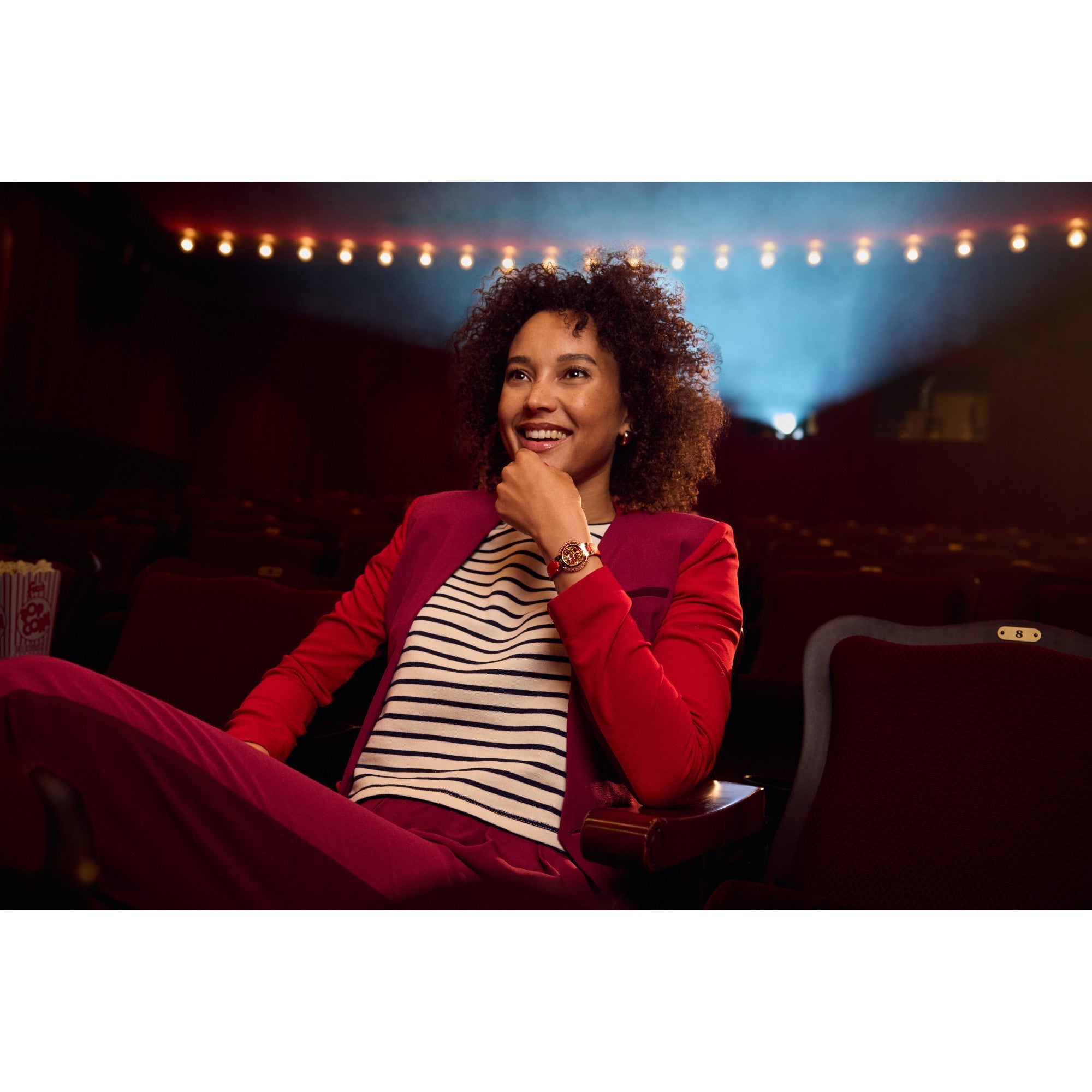 Celebrate the changing palette of nature with the Bulova 97R105 Rubaiyat “Autumn”, a special-edition ladies’ timepiece from Bulova’s storied Rubaiyat collection, re-imagined for the 150th-anniversary “Four Seasons” series. Encased in 30.5 mm gold-tone stainless steel, this exquisite watch captures the warmth of fall with a striking red dial crafted from synthetic fire opal — each dial unique in its intricate play of autumnal hues. Surrounding the dial is a halo of 42 rubies (.25 ctw) that shimmer like fall foliage, while a synthetic spinel cabochon crown adds a jewel-like signature touch. Protected by a double-curved sapphire crystal, the dial’s elegant two-hand layout is powered by a precise GL24 quartz movement, ensuring accurate timekeeping with minimal maintenance. Paired with a red calf-grain leather strap and a deployant clasp with push-button closure, this remarkable piece is presented in special Rubaiyat packaging complete with a storybook — a timeless blend of heritage, craftsmanship, and artistic expression.